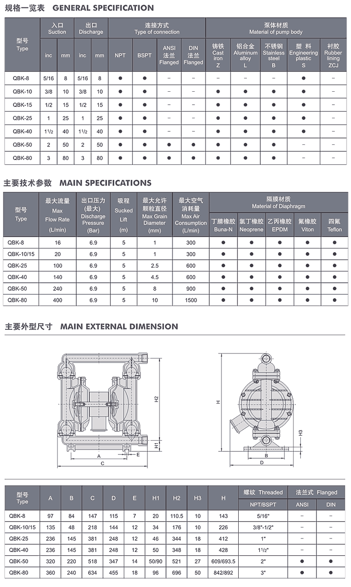 QBK型氣動(dòng)隔膜泵是目前國內(nèi)最新穎的一種泵,對于各種腐蝕性液體,帶顆粒、高粘度、易揮發(fā)、易燃、易爆、劇毒的液體、陶瓷釉漿、果漿、膠水、油輪倉庫油回收、臨時(shí)倒罐等液體均能予以抽光吸盡。